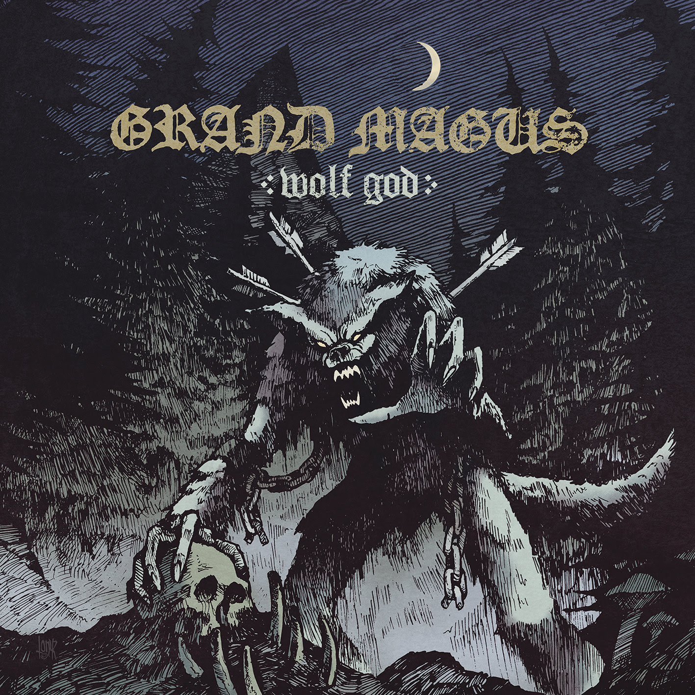 “For the third time, the magic skill and imagination of Anthony Roberts has given birth to the cover artwork for a Grand Magus album. This time the forest, the moon and obviously the wolf take center stage. Not just any wolf though… beware his fury. This is the WOLF GOD!”