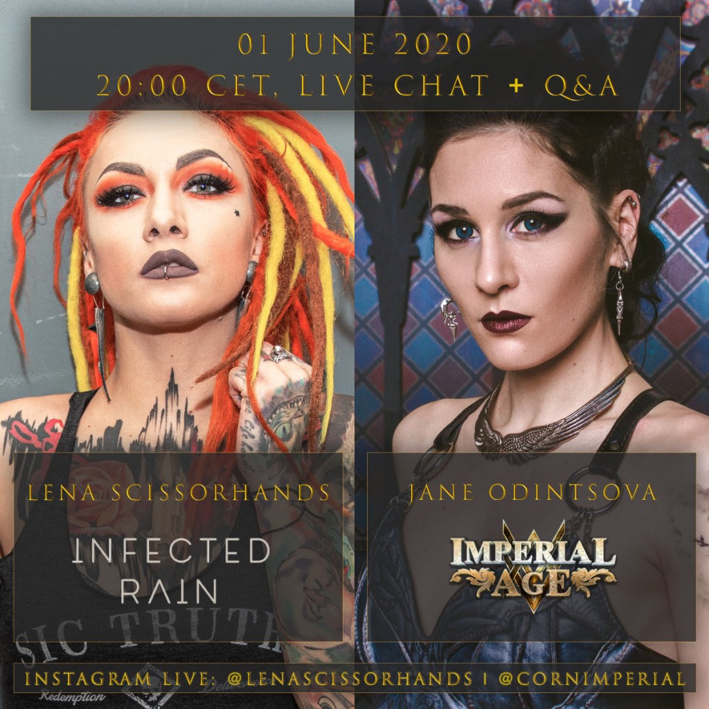 On Monday June 01, 2020 at 20:00 CET (18:00 UTC, 14:00 EDT) the lead vocalists of Infected Rain and Imperial Age will meet online in a live chat to discuss various relevant topics and to answer fans‘ questions.